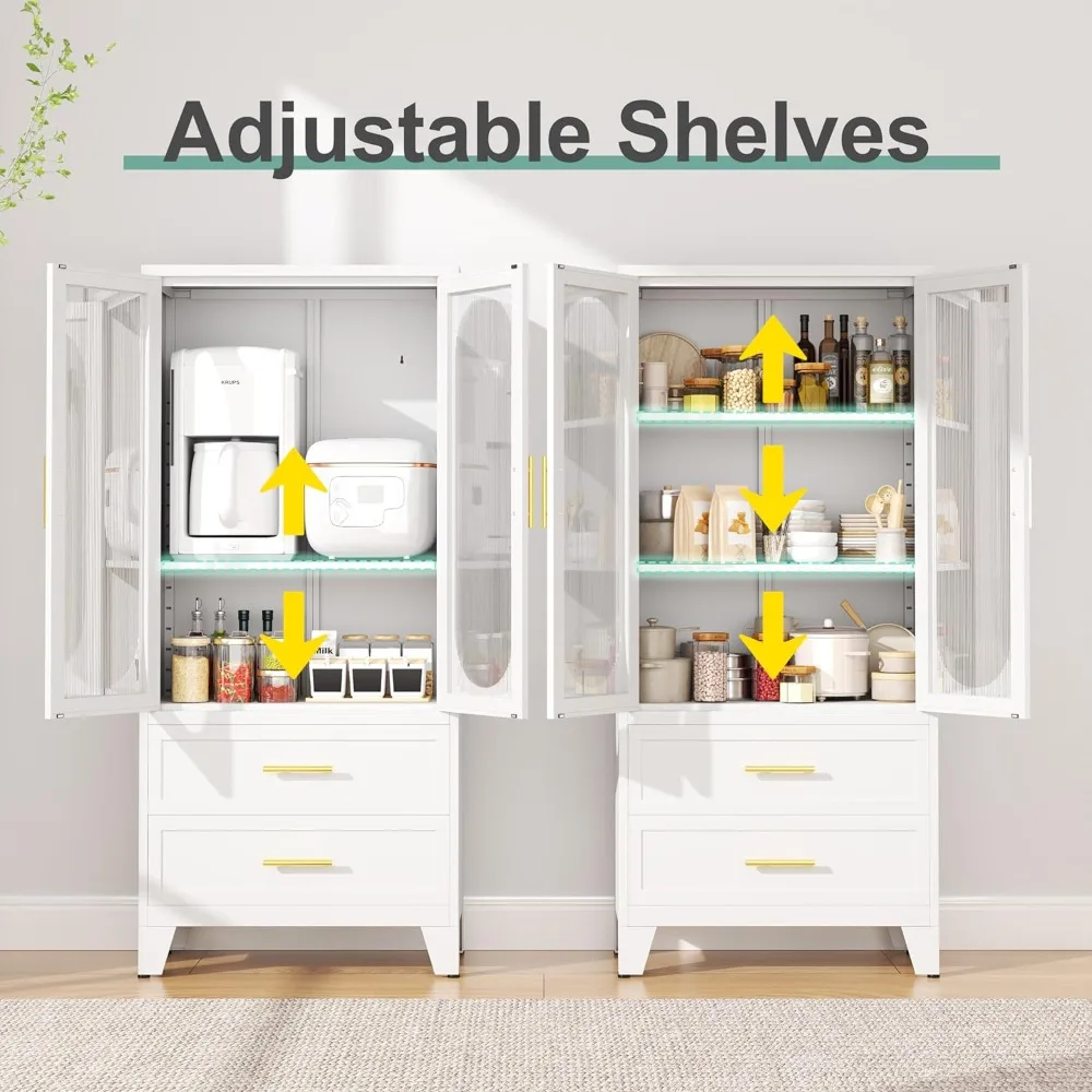- 【Large Storage Capacity】The The food pantry cabinet features two exquisite arched acrylic glass doors, with four eye-catching gold handles. Two adjustable shelves, you have the freedom to move the shelves up and down, creating limitless and unique storage spaces tailored to your needs. To further enhance functionality, this kitchen cabinet is equipped with two smoothly gliding drawers. The high-quality slide rails ensure effortless opening and closing, allowing for easy access to your stored items