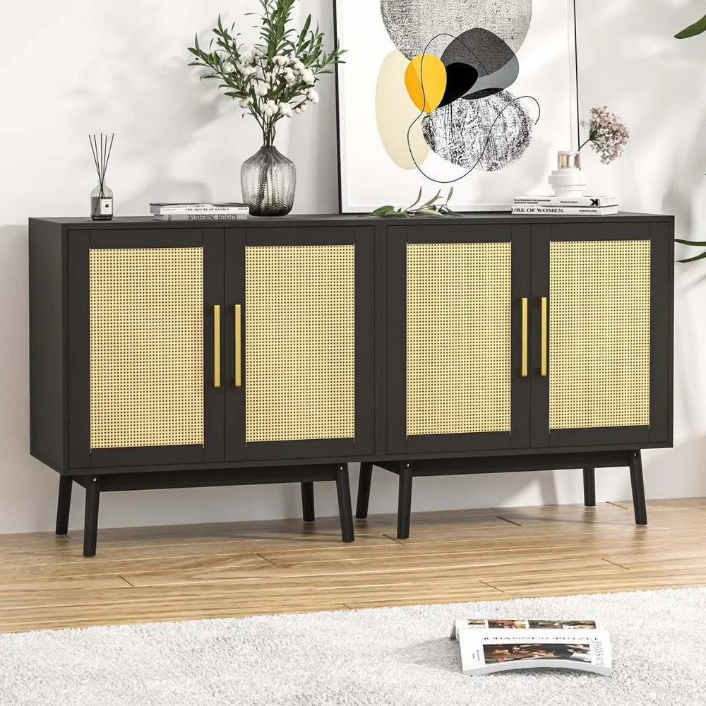 Sideboard Buffet Cabinet with Storage, Set of 2, Kitchen Buffet Storage, Black Rattan Cabinet with Doors for Hallway