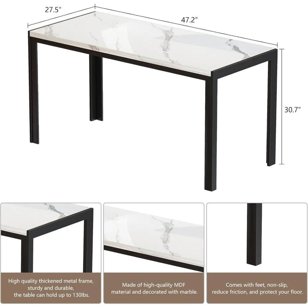 【High Quality Marble Dining Table Set for 4】The table top is made of high quality MDF material, and the surface is decorated with beautiful marble pattern, which adds an elegant atmosphere to your dining environment. 【Comfortable Upholstered Dining Bench】The bench surface is made of high elastic upholstery and PU leather, combined with the structure of heavy-duty steel, in addition to comfortable dining, it is more durable. 【Space Saving Dining Table with Bench】This dining table set contains a table (47.24*27.56*30.71 inch) and two benches (40.55*11.81*17.72 inch), two benches can be tucked under the kitchen table to save space, perfect for small spaces, small apartments, small kitchens, small studios, and more. 【Easy to Assemble & Clean Dining Room Table Set】This kitchen table with 2 benches comes with clear instructions and accessories. You can easily assemble this table set. The smooth surface of the table and bench is easy to clean and you can easily maintain it by simply wiping it with a damp cloth. 【After-Sales Guarantee Kitchen Table Set】If any part of our dining table and chair is missing or damaged during transportation, or there is any problem with installation, please contact us and we will help you solve the problem asap.